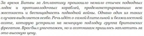 Так закончилась самое долгая для Второй мировой войны охота на «стальную акулу» в Атлантике. С момента обнаружения подлодки до её гибели прошло около 39 часов, 36 из которых субмарина провела под водой. Надо отметить, что относительно последнего факта нет окончательной ясности, так как есть сведения о возможном кратковременном всплытии субмарины на поверхность в ночь с 29 февраля на 1 марта.