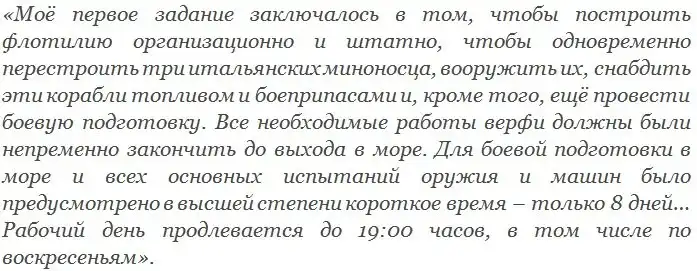 Командующий флотилией фон Камптц считал необходимым привести корабли к немецким стандартам, как в оборудовании, так и в размещении и проживании экипажа. О том, с какими трудностями ему пришлось столкнуться, свидетельствует запись в журнале боевых действий флотилии от 5 апреля 1943 года: