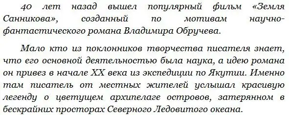 В 1924 году Обручев завершил роман «Земля Санникова, или Последние онкилоны». Писатель даже не подозревал, что этот край был известен еще древним грекам под именем Гиперборея. Именно о ней как о прародине гиперборейцев и всего человечества упоминается в некоторых древних духовных трактатах. Однако, несмотря на многочисленные попытки, обнаружить ее пока никому не удалось.