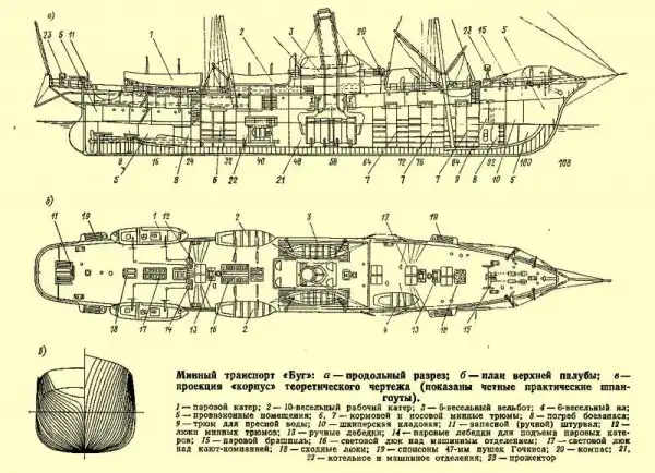 Десять водонепроницаемых переборок, доходивших до жилой палубы, разделяли корпус на 15 изолированных отсеков; в его средней части на протяжении 36 м предусматривалось двойное дно. Энергетическая установка состояла из двух паровых машин тройного расширения, суммарной индикаторной мощностью 1400 л.с. и четырех цилиндрических котлов с общей нагревательной поверхностью 423,6 кв. м. Оговаривалось, что при полном водоизмещении и естественной тяге в котлах скорость на приемочных испытаниях должна быть не менее 13 уз. Предусматривавшая проектом довольно развитая водоотливная система, состоявшая из трех частей, включала две центробежные помпы Гвина, три Даунтона и две паровые донки Вортингтона. Для размещения 425 мин заграждения предусматривалось четыре трюма - три в носовой части, один в кормовой, позади машинного отделения; кроме того, 120 мин с якорями размещались в кормовой части жилой палубы, вдоль бортов. Артиллерийское вооружение состояло из десяти пушек Гочкиса: шести 47-мм одноствольных, размещенных по бортам, в том числе четыре в спонсонах, и четырех 37-мм пятиствольных (по две в носовой части верхней палубы и на крыльях мостика).