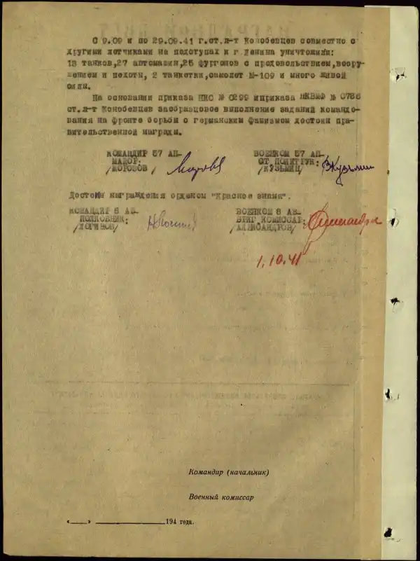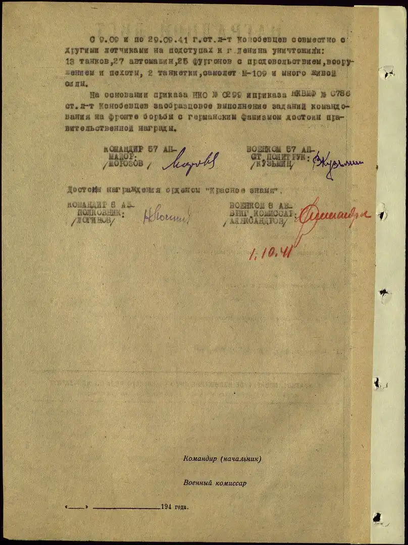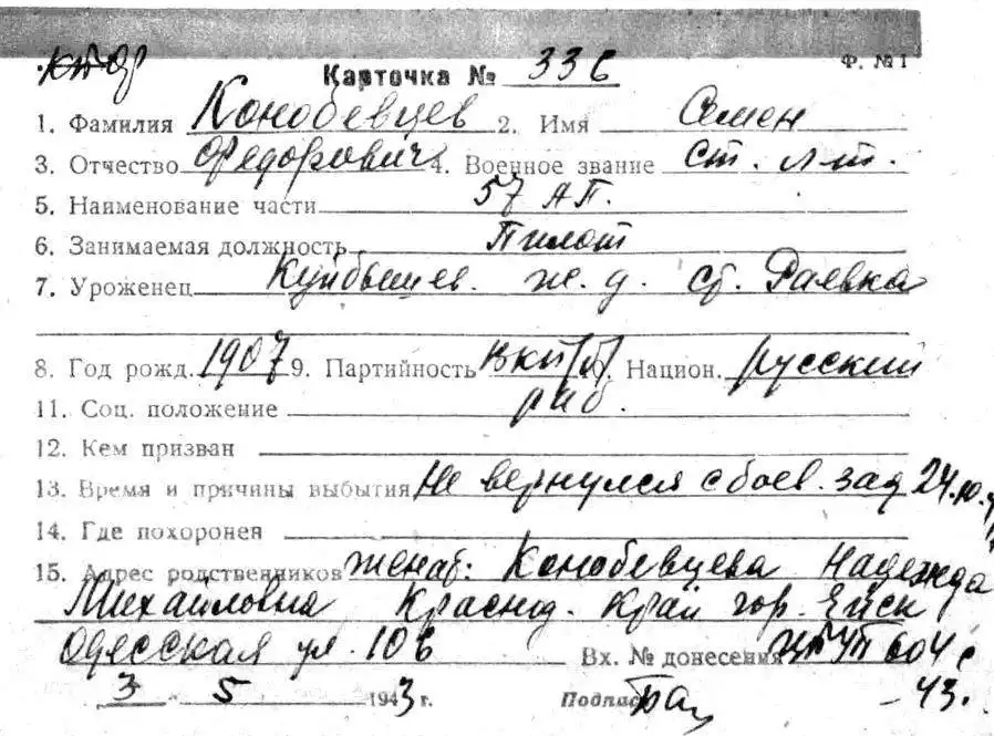 «Конобевцев Семен Федорович, 1907 г.р. Старший лейтенант, пилот 1 АЭ. 24.10.1941 при выполнении боевого задания в районе 1-го Городка обстрелян ЗА, упал в реку Нева».