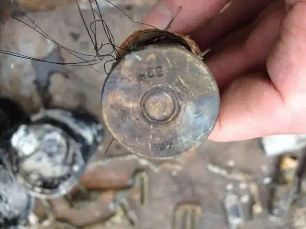 На поясном ремне висела кобура флотского образца, внутри которой лежал 7,62-мм револьвер системы Нагана образца 1895 года. Ствол револьвера погнут, на левой стороне выбито клеймо в виде пятиконечной звезды, внутри которой изображена стрела с оперением и год изготовления – 1931.
