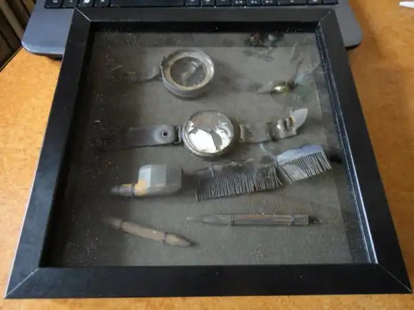 Кроме того, поисковики нашли фрагменты лямок от парашютной системы с пряжками и замками, компас, наручные часы, расчёску, курительную трубку и записную книжку.