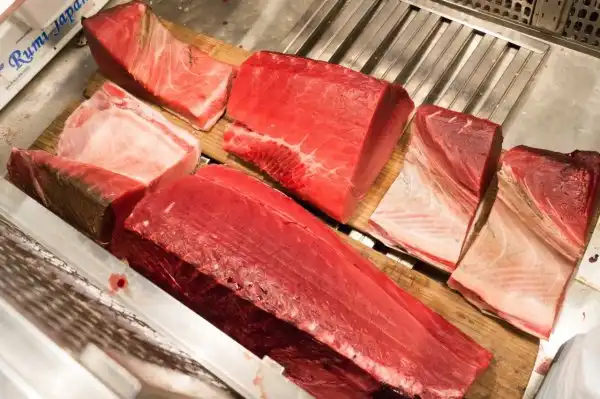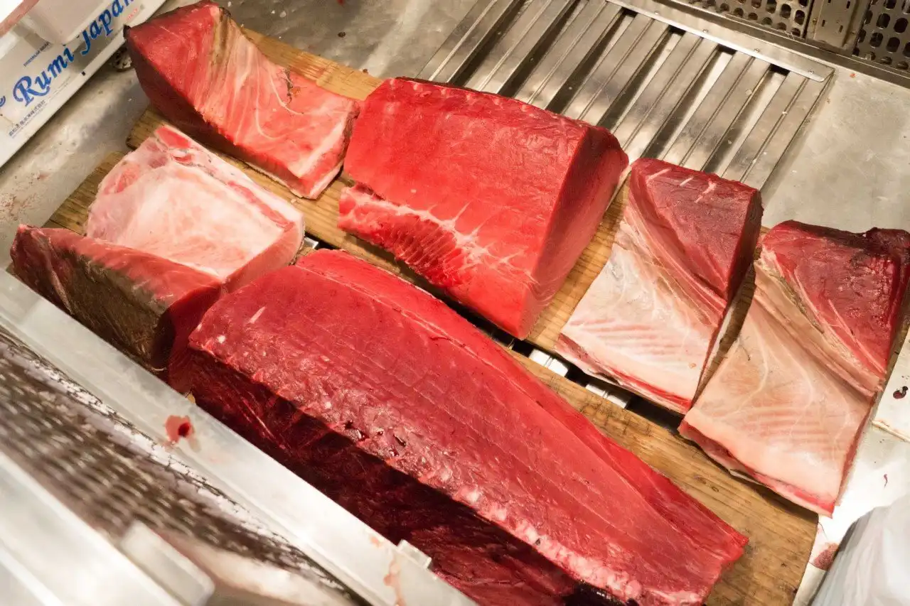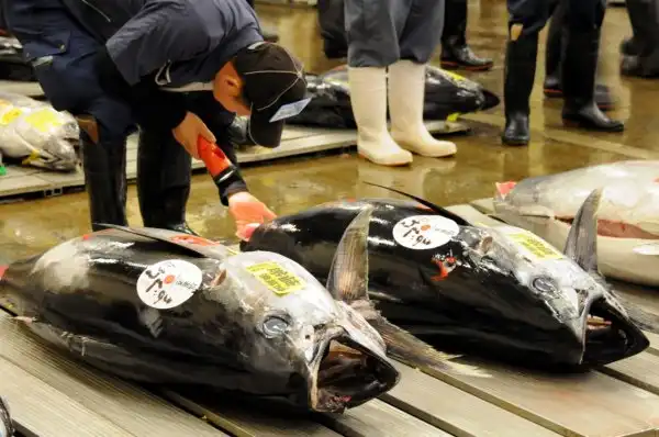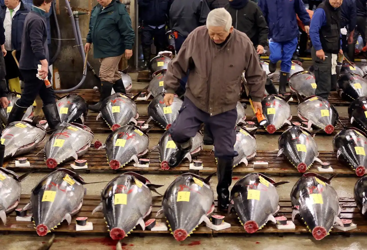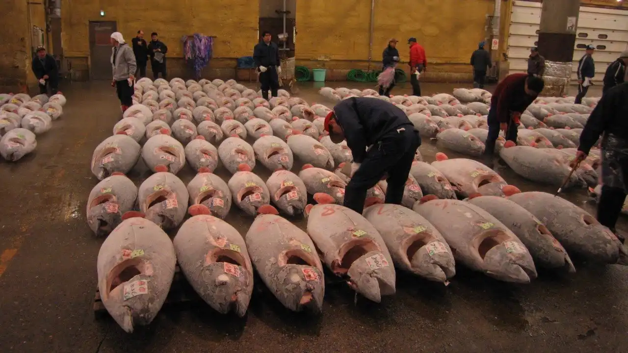Ключевая фигура торгового процесса — это тунец, рыба дорогостоящая, обладающая массой полезных пищевых свойств. Тысячи гигантских туш тунца поступают на рыбный рынок Цукидзи каждый день, где ждут своего часа, а именно начала аукциона. Продавцы готовятся к этому действу, подробно изучая качество сырья, а для выделения лучшего товара все тушки нумеруются. С этой целью каждую тушку осматривают со всех сторон, поднимая и перетаскивая с помощью специальных больших крюков. Истинные знатоки способны обнаружить едва уловимые различия по качеству, проведя рукой по поверхности туши и оценив её гладкость и упругость. Лучшими признаются самые мясистые, плотные туши.