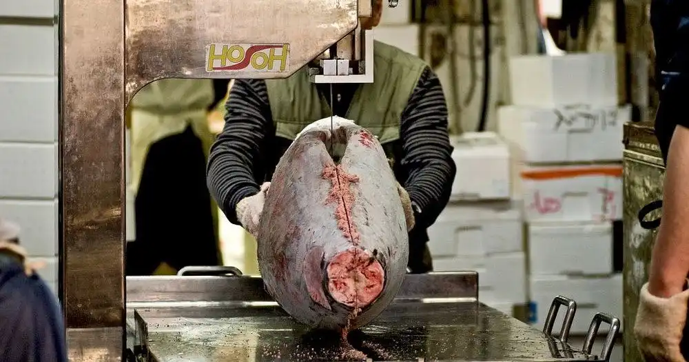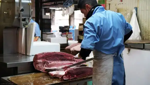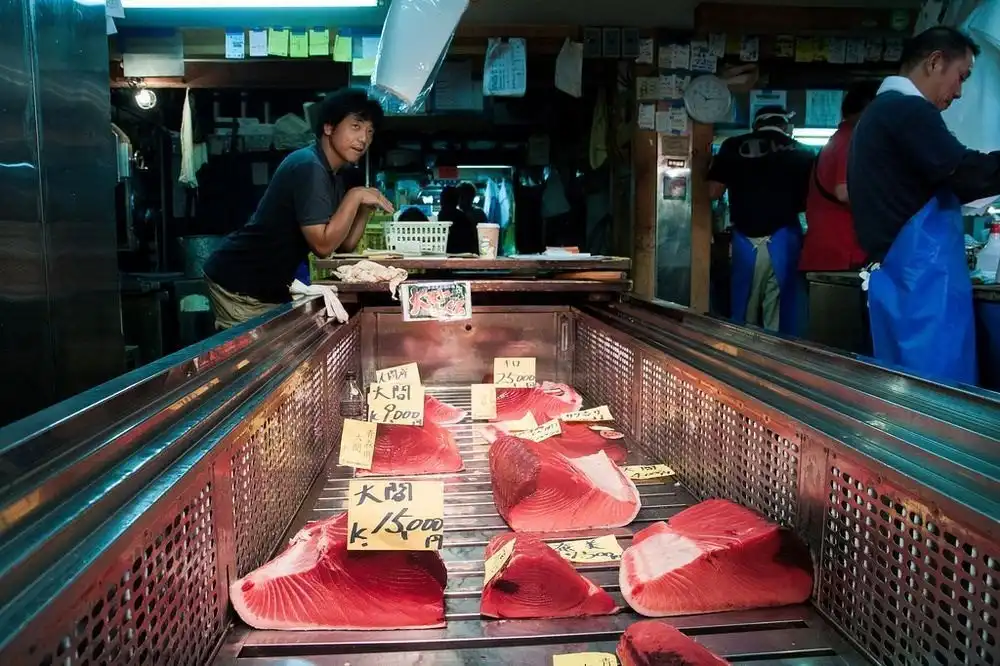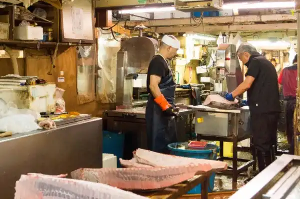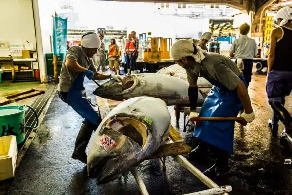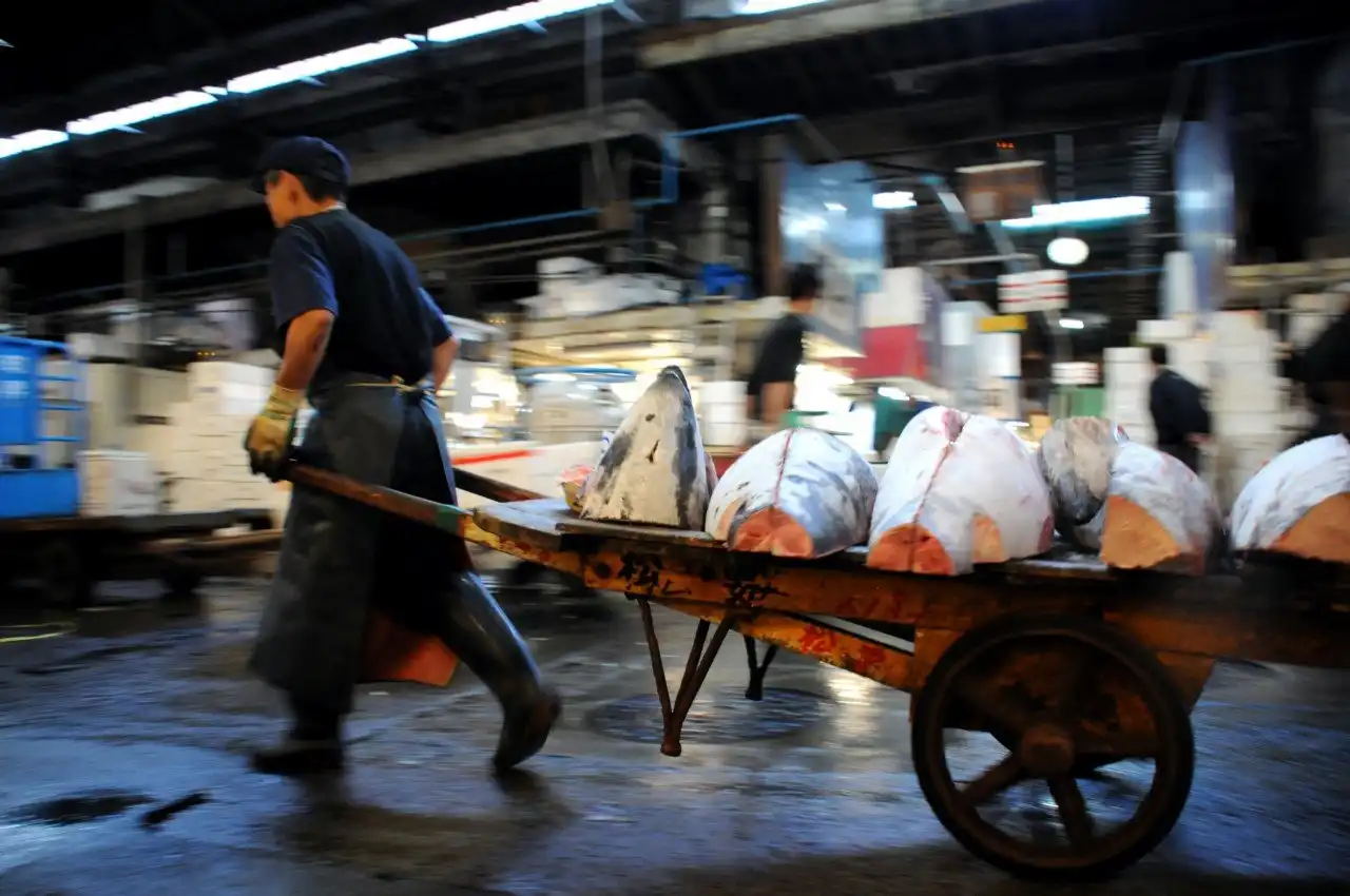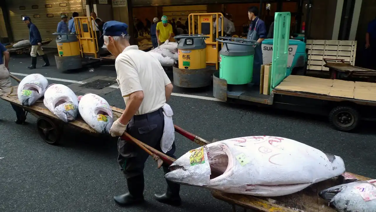 По окончанию очередных торгов замороженные туши тунца грузят на поддоны, отмывают, распиливают на бруски, погружают в электрокары и отправляют на отгрузку. К тому времени, когда офисы японской столицы только-только начинают новый трудовой день, рынок Цукидзи в Токио уже завершает свою работу: последние партии обработанной рыбы погружаются в холодильные контейнеры из пенополистирола и поставляются до дверей клиента.