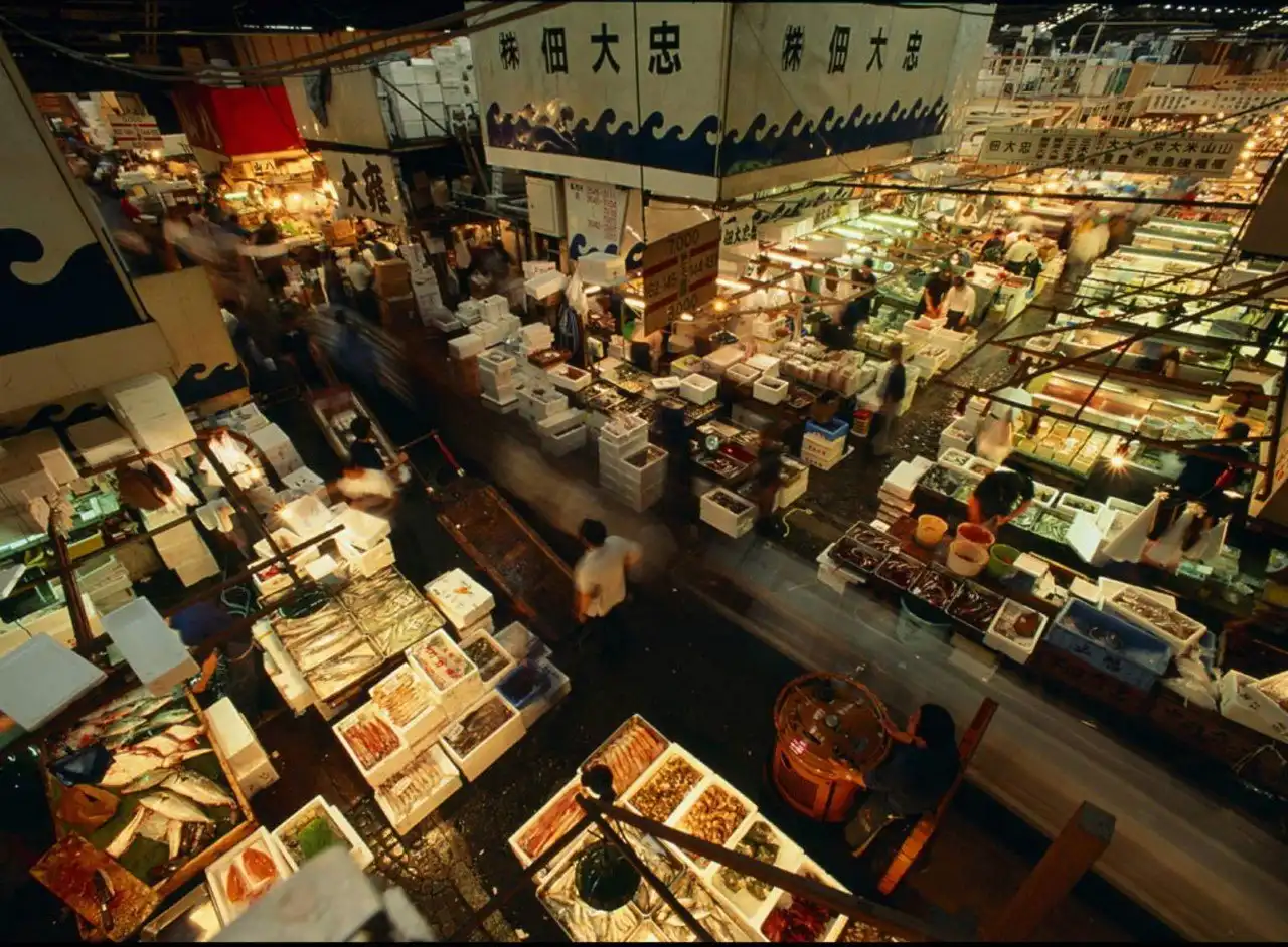 Итак, когда город ещё дремлет в ночной мгле, на рынке начинается настоящее столпотворение. В сумасшедшем темпе многотысячная армия работников снуёт туда-сюда по огромной площади рынка. Рабочие таскают туши рыб, разрезают глыбы льда, перекрикиваются, смеются, разделывают угрей и шумят ещё громче. Во всём этом хаотичном движении находится место и для электромобилей, транспортирующих сырьё на отгрузку. Наблюдая за подобным оживлением, особенно легко можно представить единую неведомую энергию, приводящую огромный механизм рынка в движение. Каждый день тысячи килограммов даров моря проходят через рынок Цукидзи, небольшая из них идёт на экспорт, остальное же в считанные часы оказывается в местных ресторанах и спустя ещё некоторое время превращается в изысканные блюда.