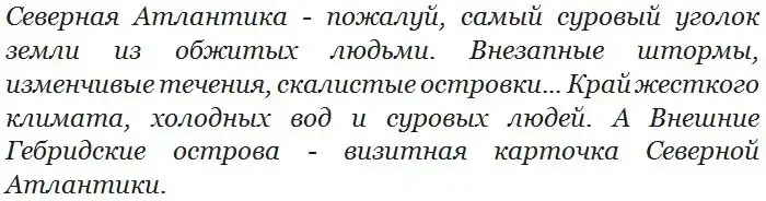Регулярное судоходство здесь невозможно из-за капризов погоды и непредсказуемости моря. Да и к берегу практически негде причалить - скалы, шхеры, отмели и волны высотой в десятки метров. Иной раз на Внешних Гебридах с трудом насчитывают 60 солнечных дней в году. Остальные - пасмурные, с дождем, снегом и туманом.