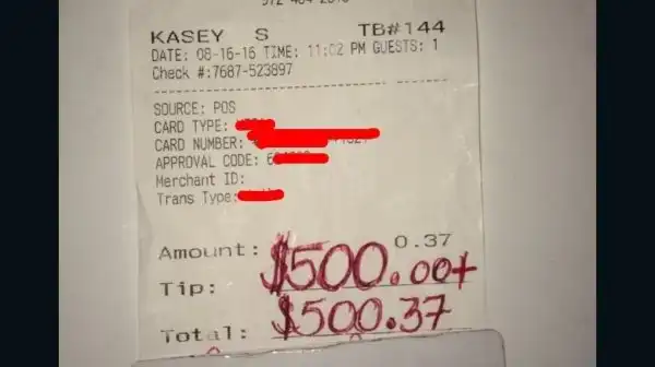 Сумма в счёте в итоге составила 37 центов, а вот на чай ему оставили $500. Почему, объяснялось в записке на салфетке.