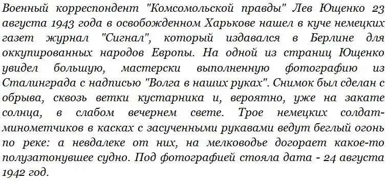 Та отмель осталась за кадром немецкого снимка. А еще год спустя, в октябре 1944-го, военкор "Комсомолки" снова увидел фотографию в полуразрушенном немецком городке Эйдткунен. В старинном одноэтажном кирпичном здании, где было казино для офицеров дивизии, оборонявшей город, над стойкой бара висело три большие фотографии в деревянных рамках. Они, скорее всего, поднимали дух и веру в победу у солдат Вермахта: портрет Гитлера, панорама Эльбруса с фашистским флагом на вершине и догорающий на Волге санитарный пароход.