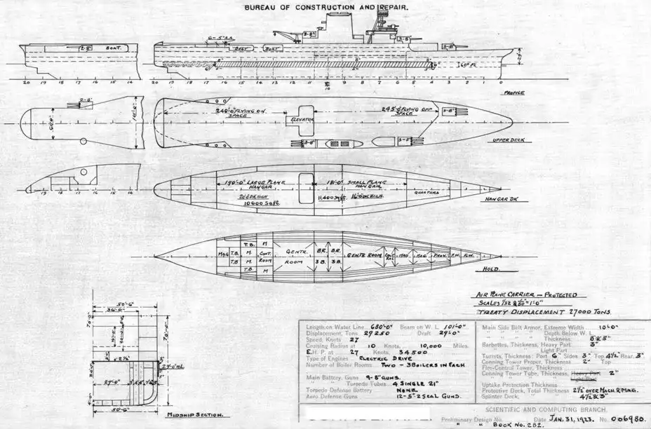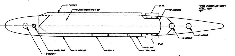 Первый из этих проектов одновременно походил на авианосец «Лексингтон» и крейсер типа «Омаха». Корабль должен был нести четыре 152-мм двухорудийных установки, расположенных в кормовой части (с углами обстрела всего в 150°), а также четыре двухъярусных каземата с той же «Омахи» (в носовой части, с углами обстрела всего в 100°). Кроме того, на корабле должны были находиться двенадцать 127-мм универсальных орудий и три трёхтрубных торпедных аппарата. Пояс толщиной в 178 мм в верхней части и 102 мм на нижней кромке прикрывался 70-мм палубой. Машины суммарной мощностью в 180 000 л. с. (две турбинных установки с «Омахи») должны были обеспечить гиганту ту же скорость – 34 узла.