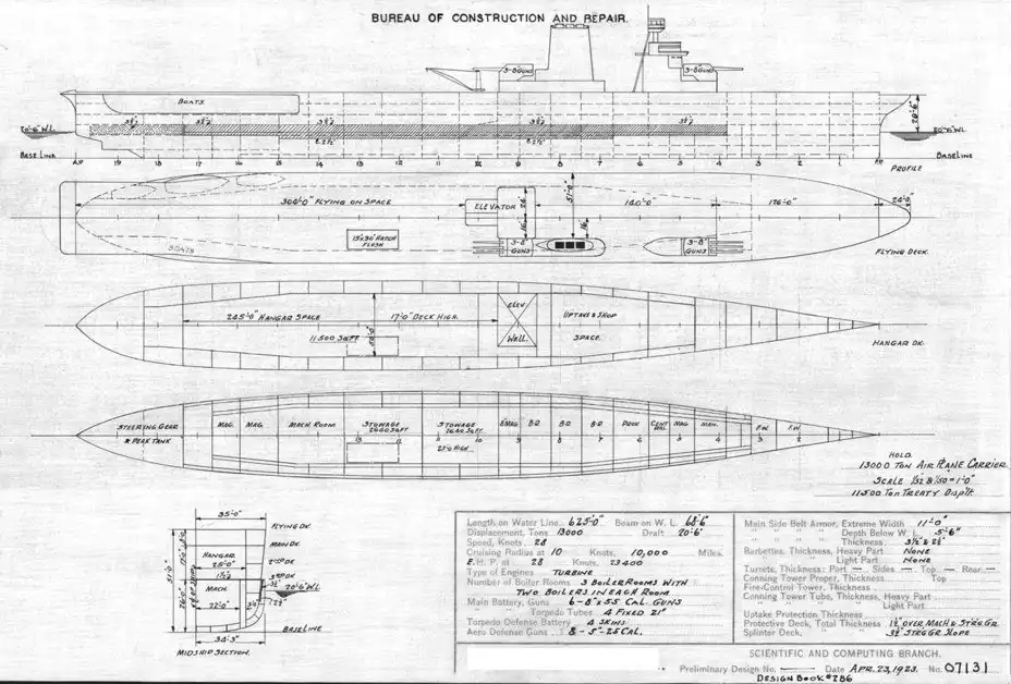 Главной трудностью проектирования такого корабля стало увязывание полноценных артиллерийских качеств (в том числе, максимальных углов обстрела орудий) с наличием полётной палубы. В итоге все три башни главного калибра пришлось вынести в нос, а длину полётной палубы максимально сократить. При такой компоновке все три башни имели углы обстрела в корму до 60°. Изначально Бюро аэронавтики требовало, чтобы длина полётной палубы составляла не менее 400 футов (122 м) при ширине в 65 футов (20 м) и наличии двух самолётоподъёмников, в то время как проектировщики предлагали 96 м. В конце концов, стороны сошлись на варианте с 350-футовой (106-метровой) палубой и одним самолетоподъёмником в носу; предполагалось, что взлётные и посадочные операции будут производиться раздельно. Авиагруппа состояла из 24 самолётов, скорость корабля соответствовала скорости уже строившихся восьмидюймовых крейсеров (32,5 узла), а водоизмещение укладывалось в «вашингтонские» ограничения (10 000 т).