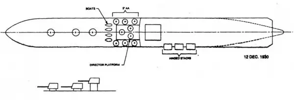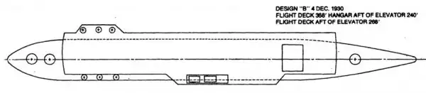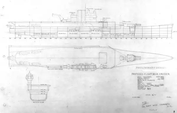 Наконец, 13 000-тонный авианосец предполагалось вооружить шестью 203-мм орудиями в двух башнях впереди и позади «острова». Корабль должен был иметь 89-мм пояс, 38-мм палубу и развивать скорость в 28 узлов.