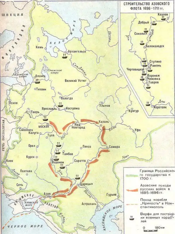 Уже в январе 1696 года на верфях Воронежа и в Преображенском (подмосковное село на берегу Яузы, там располагалась резиденция отца Петра, царя Алексея Михайловича) развернули масштабное строительство кораблей, судов. Галеры, построенные в Преображенском, разбирали, везли в Воронеж, там снова собирали и спускали на воду на Дону. Пётр приказал к весне сделать 1300 стругов, 30 морских лодок, 100 плотов. Для этого со всей России мобилизовали плотников, кузнецов, работных людей. Район Воронежа выбрали не случайно, для местного населения строительство речных судов было обычным промыслом уже не одно поколение. Всего мобилизовали свыше 25 тыс. человек. Со всех концов страны ехали не только мастера, рабочие, но и везли материалы – лес, пеньку, смолу, железо и пр. Работы шли быстро, к началу похода стругов построили даже больше, чем планировали.