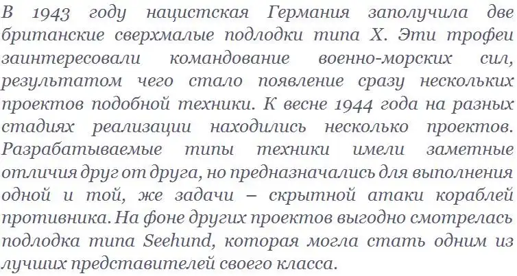 Разработка проекта Seehund («Тюлень»), также известного под названием «Тип XXVIIB», началась в первых месяцах 1944 года. В это время немецкие специалисты занимались несколькими проектами сверхмалых подлодок, что позволило авторам «Тюленя» применить ряд интересных решений. Субмарины типов Hecht и Molch создавались с максимально возможным использованием существующих агрегатов, что, как ожидалось, должно было упростить и удешевить их массовое производство. В ходе испытаний и эксплуатации выяснилось, что подобный подход не оправдал себя в полной мере. По-видимому, заказчик и разработчик заранее понимали, к чему может привести унификация и приняли определенные меры. В отличие от других сверхмалых подлодок, Seehund должна была создаваться на основе новых идей и предложений. Перед инженерами не ставилась задача обеспечить максимальную унификацию с существующей техникой. В результате удалось создать проект, имеющий большие отличия от прочей аналогичной техники. Разница была видна даже по внешним очертаниям: Hecht и Molch напоминали увеличенные торпеды с новым оборудованием, тогда как Seehund была похожа на уменьшенную подлодку. Подлодка Seehund в одном из немецких музеев. Фото Juergenthuro.deВ 1943 году нацистская Германия заполучила две британские сверхмалые подлодки типа X. Эти трофеи заинтересовали командование военно-морских сил, результатом чего стало появление сразу нескольких проектов подобной техники. К весне 1944 года на разных стадиях реализации находились несколько проектов. Разрабатываемые типы техники имели заметные отличия друг от друга, но предназначались для выполнения одной и той же задачи – скрытной атаки кораблей противника. На фоне других проектов выгодно смотрелась подлодка типа Seehund, которая могла стать одним из лучших представителей своего класса.