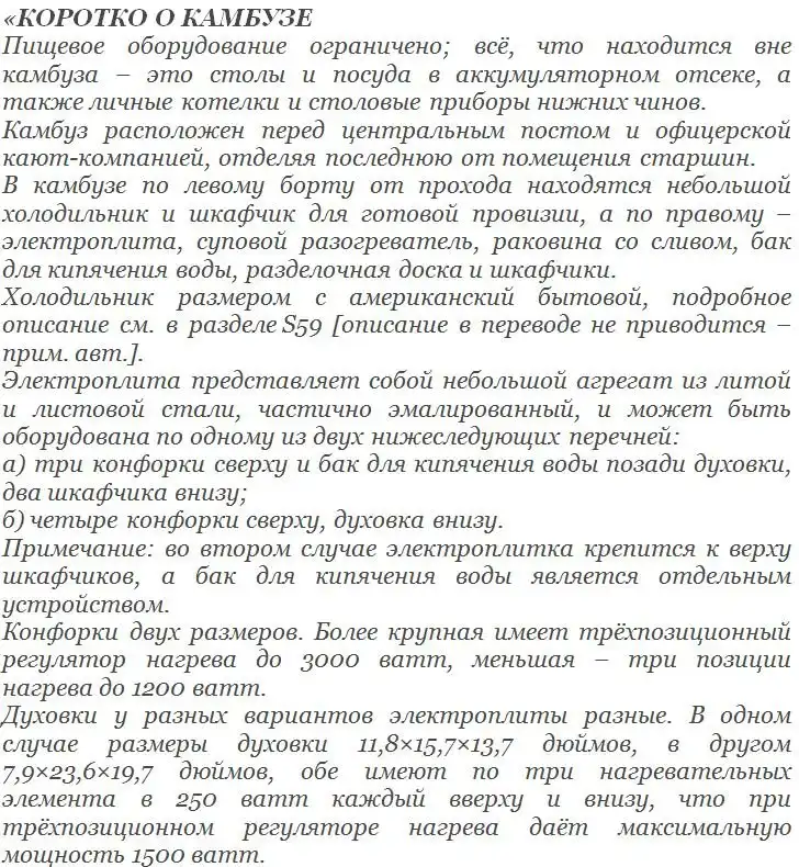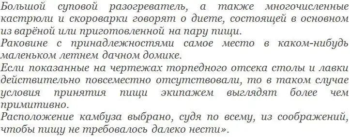 Чтобы понять, что из себя представлял камбуз на немецкой подлодке, обратимся к его описанию, составленному на верфи ВМС США в Портсмуте в июле 1946 года при изучении немецких подлодок типа IXC, сдавшихся американцам после капитуляции Германии (перевод. Е. Скибинского):