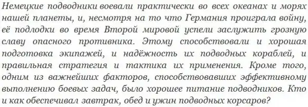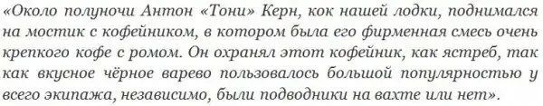 2. Наличие готового кофе в любое время суток. Для заступающих на вахту ночью кок готовил кофе по особому рецепту. Как вспоминал бывший член экипажа лодки U 505 Ганс Гёблер (Hans Goebler), это был мощный стимулятор бодрости: