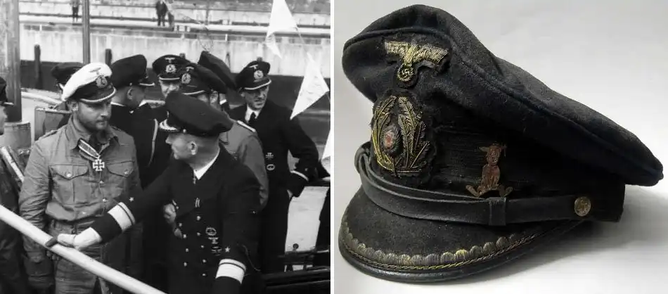 Корветтенкапитан Фриц Лемп беседует с адмиралом Деницем. Справа - фуражка Лемпа, выловленная англичанами из воды на месте его гибели. 9 мая 1941 года подводная лодка U-110, которой он тогда командовал, получила серьезные повреждения. Лемп решил, что она обречена и приказал команде спасаться вплавь. Однако субмарина не затонула и стала английским трофеем, а сам Лемп захлебнулся или был пристрелен англичанами, решившими не брать его в плен.