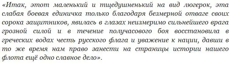Но, как бы то ни было, русские моряки с честью выполнили свой долг, нанеся поражение более сильному противнику. В заключение можно привести слова, которыми участник боя Пётр Барановский заканчивает свои мемуары: