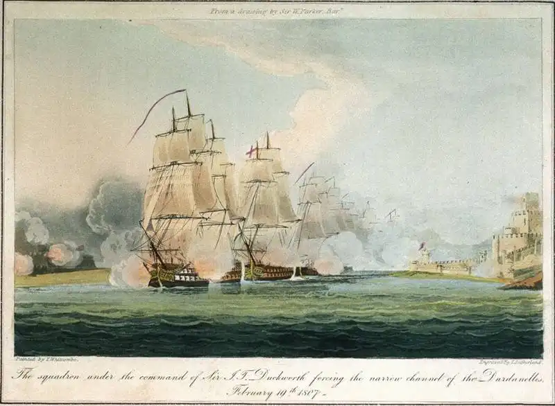 7 февраля 1807 г. по приказу Коллингвуда эскадра вице-адмирала Дакворта в составе 7 линейных кораблей, 3 фрегатов и 2 бомбардирских кораблей вошла в Дарданеллы. На ней находился заранее покинувший турецкую столицу английский посланник Чарлз Арбатнот. Огонь береговых батарей был слабым и неорганизованным, и уничтоживший по пути несколько попавшихся под руку турецких судов Дакворт 9 февраля подошел к Стамбулу. Вид английской эскадры не смутил турок, к тому же наступил штиль. Пока британский посол перебрасывался со своим французским коллегой генералом Себастьяни дипломатическими снарядами в письменном виде, турки под руководством французских инженеров спешно укрепляли Стамбул и берега Дарданелл. Дипломаты крадучись пробирались сквозь лабиринты эпистолярного жанра, а османы тем временем развернули на берегах своей столицы больше ста пушек и мортир. Дакворт не решился высаживать десант, а счел за благо покинуть негостеприимные для себя воды Мраморного моря. 19 февраля англичане подняли, наконец, паруса, увозя вместо покорности турок кипу французских газет с едкими статьями, присланных в насмешку предприимчивым Себастьяни. Небольшой отряд из мичмана и матросов, отправленный на шлюпке за провизией на берег и захваченный турками, был фактически брошен на произвол судьбы.