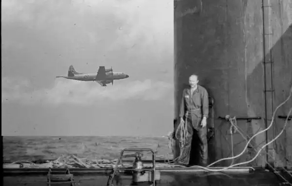Командир Британов приказал экипажу покинуть корабль и перейти на подоспевшее советское торговое судно. На снимке капитан 2 ранга Британов отправляет поледнюю партия подводников с борта АПЛ и остаётся на корабле один. На заднем плане - разведывательный самолёт НАТО "Орион". Сам он до последнего стоял на мостике и охранял корабль от возможных попыток захвата вражескими силами с автоматом Калашникова в руках. Он покинул корабль только тогда, когда от кромки воды до рубки оставалось несколько сантиметров. А потом он почти год ожидал суда, но был помилован, но с флота уволен.