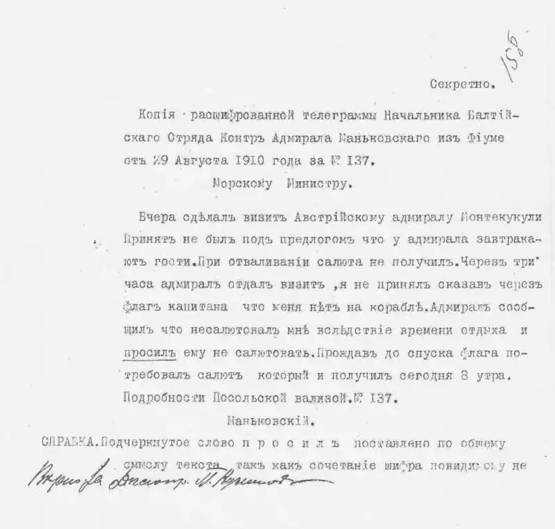 Копия расшифрованной телеграммы начальника Балтийского Отряда Контр Адмирала Маньковскаго из Фiyме от 9 Августа 1910 года за № 137.