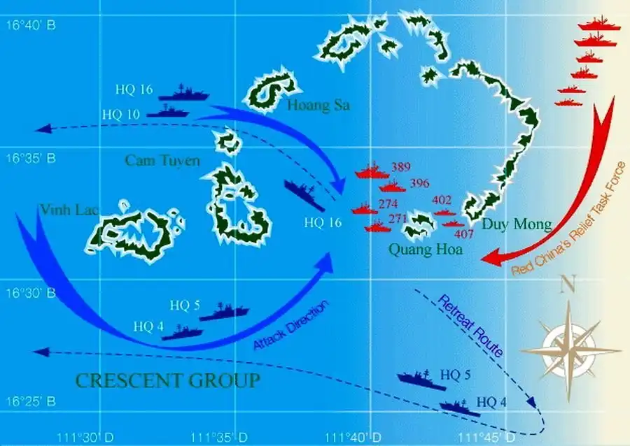 15 января 1974 года два китайских «мирных рыболовецких траулера» №№ 402 и 407, вооружённых пулемётами, подошли к четырём необитаемым островам группы Круассан и установили на них флаги КНР. На одном из них – острове Дункан – был высажен под видом «мирных рыбаков» батальон морской пехоты НОАК, приступивший к возведению укреплений.
