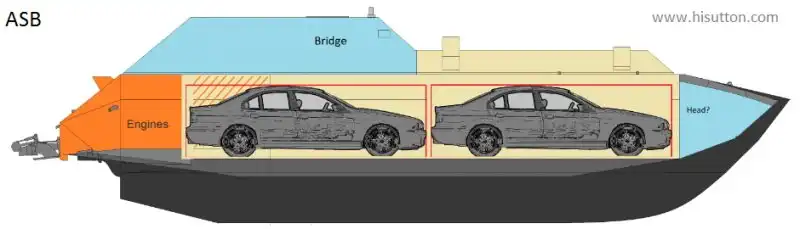 Для хранения и транспортировки автомобилей катер ASB получил не самое сложное оснащение. Ближе к корме корпуса прямо на поперечные силовые элементы были уложены две металлические пластины, на которых должен был помещаться один из перевозимых автомобилей. На своем месте он фиксировался упорами-башмаками и, возможно, тросами. Для загрузки техники и транспортировки второй машины катер имел еще одну пару пластин. В носовой части трюма были установлены два гидравлических подъемника, аналогичных используемым в автомастерских. На подъемных балках этих устройств жестко крепились пластины для установки автомобиля. Подъемное устройство могло использоваться как для загрузки или выгрузки машин, так и для транспортировки одной единицы незаконного товара.