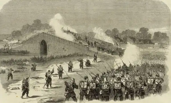 Рукопашный бой на мосту Балицяо, европейская гравюра XIX века