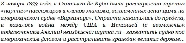 (Однако такие «треволнения» оказались роковыми для еще не старого вроде парохода – 26 декабря 1873 года он затонул на переходе в Атлантике у мыса Гаттерас). Понятно, что лет двадцать спустя такие уступки ни в коей мере не устроили бы Вашингтон, но в 1873 году воевать с Испанией Штатам было не с руки.