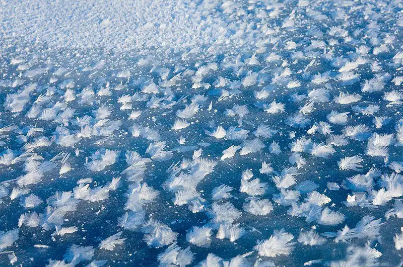 Для «чуда» нужен экстремальный холод (воздух должен быть холоднее поверхности воды) и сухость воздуха. При таких условиях воздух «вытягивает» влагу из океана, в воздухе она моментально застывает, создавая нежные, похожие на перья диковинной птицы, структуры. Иногда они возвышаются над водой на 7-10 см. И тогда поверхность действительно очень напоминает цветущий луг.