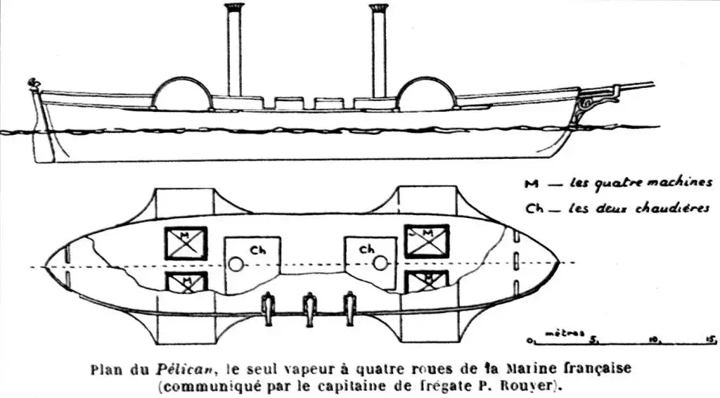 Как известно, первые колёсные пароходы были тихоходными. А как можно повысить их скорость, если машины простого расширения пара по определению маломощные? Конечно, путём увеличения числа машин! Таким образом, появление этого необычного парохода, получившего имя «Пеликан», было вполне предсказуемым. Сама идея оснастить судно четырьмя паровыми машинами и четырьмя гребными колёсами выглядела вполне логичной. А чтобы убедиться в сложности осуществления этой простой идеи, надо было попробовать…