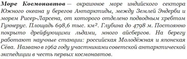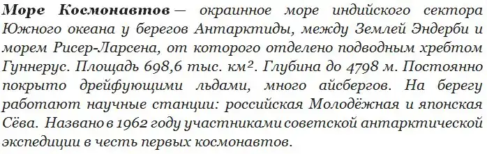 Работами Советской антарктической экспедиции и экспедиций зарубежных стран, выполненными в водах Антарктики в эти годы, было установлено, что особенности конфигурации береговой черты Антарктиды, рельефа дна, гидрологического и ледового режима, циркуляции вод позволят, помимо существующих, выделить ряд новых, прилегающих к континенту акваторий, в самостоятельные географические объекты — окраинные моря. Одно из них, расположенное между полуостровом Рисер-Ларсена и северным выступом Земли Эндерби, было названо морем Космонавтов в честь первых людей, проникших в космическое пространство. Первые плавания судов в водах моря Космонавтов начались во второй половине XVIII века.