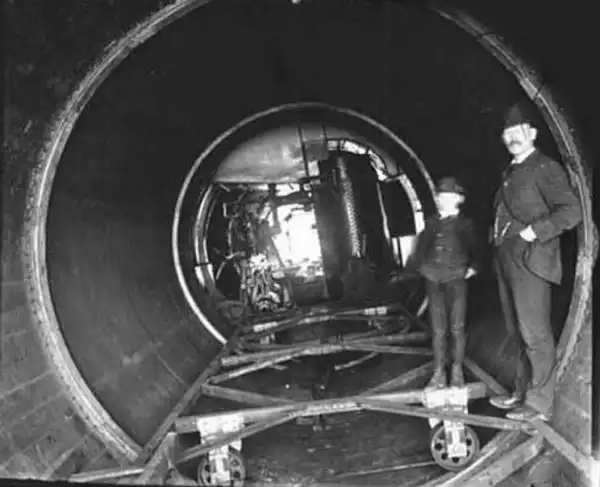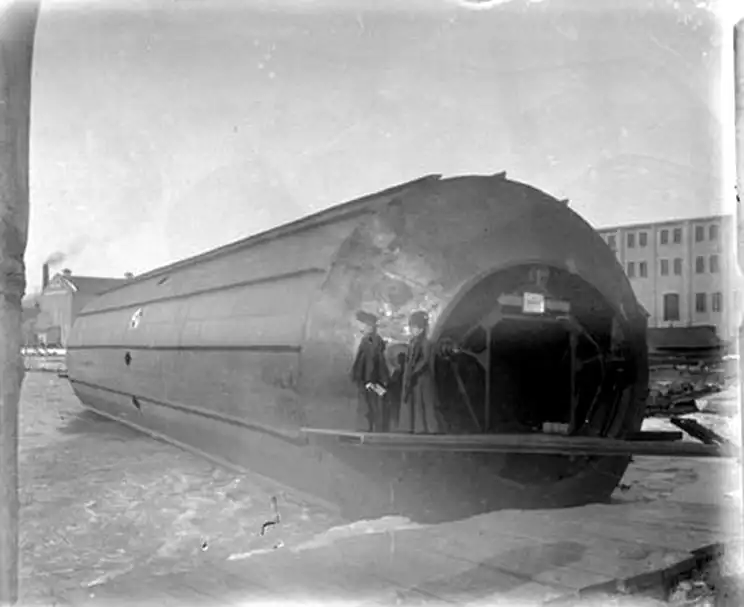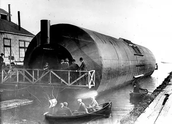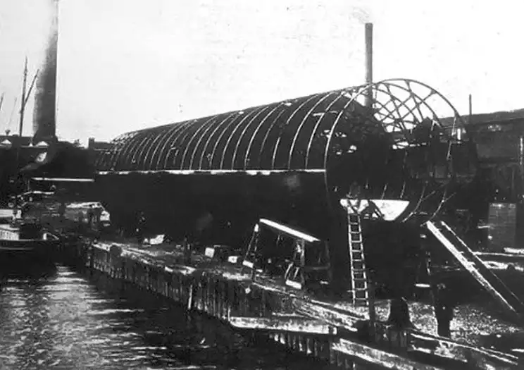 Спуск на воду странного судна состоялся 8 сентября 1897 года. Его размеры были не такими уж маленькими: длина его наружного цилиндра равнялась 110 футам 33,5 м), диаметр – 22 фута (6,7 м). Внутри наружного цилиндра на специальных роликах был установлен внутренний цилиндр чуть меньшего диаметра. В нём находились уголь и экипаж, а в оконечностях размещались две паровые машины с котлами и механизмами вращения наружного корпуса.