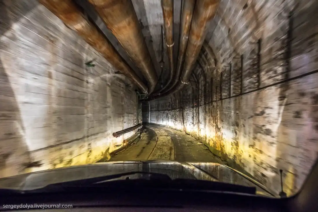 Туда прямо на машине заехали. Внутри длинный коридор с ответвлениями. В ответвления не совались, а по туннелю проехали: