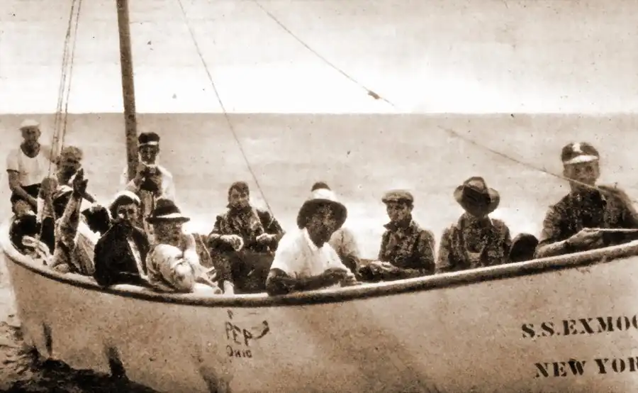 Моряки из экипажа «Робина Мура» в спасательной шлюпке.