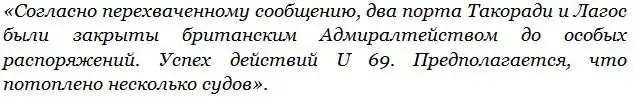 U 69 прекрасно справилась с поставленной задачей и стала первой «семёркой», действовавшей в южных водах Атлантики. 4 июня Метцлер отправил сообщение в Дёницу о минировании портов с расходом четырёх мин на Такоради и восьми на Лагос. В тот же день при входе в гавань Лагоса подорвалось на минах и затонуло британское судно. Адмиралтейство, обеспокоенное этим случаем, объявило оба порта временно закрытыми, о чём стало известно немцам. 29 июня адмирал Дёниц сделал в журнале боевых действий командующего подводными силами следующую запись:
