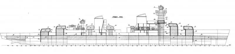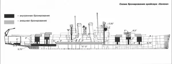 Что до американских легких крейсеров, то их схема защиты представляется крайне сомнительной. Мы уже описывали ее ранее, на примере крейсеров типа «Бруклин» и сейчас только повторим основные моменты – цитадель «Бруклина» была мощнее, чем у проекта 68 – высотой 4,2 м (против 3,3 у советского крейсера) она на протяжении 2,84 м имела толщину 127 мм, далее утоньшалась к нижней кромке до 82,5 мм. Сверху цитадель защищалась 50 мм палубой, чья толщина к бортам сокращалась до 44,5 мм. Но протяженность этой цитадели составляла всего лишь около трети корабля (не более 56 м) против 133 м советского крейсера. Вне цитадели в нос корпус имел узкий (меньше одного межпалубного пространства) подводный бронепояс толщиной 51 мм, поверх которого лежала такая же 44,5-50 мм палуба. Единственной функцией носового бронирования вне цитадели являлась защита артиллерийских погребов: участие и бронепояса, и бронепалубы в обеспечении живучести было совершенно незначительным, если не сказать - ничтожным, поскольку и то, и другое находилось ниже ватерлинии. Таким образом, и снаряды, и бомбы, попавшие в носовую часть «Бруклина», способны были разрушать ничем не защищенные корпусные конструкции вызывая обширные затопления поверх бронепалубы. Более того – «подводная» бронепалуба при попадании авиабомб, если и могла выдержать их удар, то все равно инициировала подрыв боеприпаса на уровне ниже ватерлинии, т.е. фактически делая все для того, чтобы корабль получил подводные пробоины.