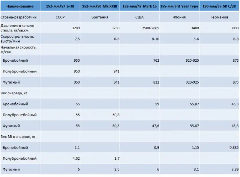 В целом же можно констатировать следующее: в деле создания шестидюймовых пушек в мире просматривалось 2 тенденции. Первая (англичане и американцы) предполагала относительно нетяжелый снаряд при умеренной начальной скорости, что давало орудиям высокую скорострельность, столь необходимую для противостояния вражеским эсминцам, но затрудняло поражение целей на больших дистанциях. Второй подход (японцы) заключался в том, чтобы создать пушку рекордных ТТХ по части массы и скорости снаряда, чем достигалась хорошая точность на больших дистанциях боя, но из-за относительно невысокой скорострельности снижалась эффективность стрельбы по быстроходным целям. СССР предпочел третий (и надо честно признать, достаточно нахальный) путь - артсистему, которая будет обладать достоинствами обоих вариантов, не имея при этом их недостатков. Что удивительно, у советских конструкторов все получилось: свидетельством тому долгая и беспорочная служба 152-мм/57 пушек Б-38 в ВМФ СССР.