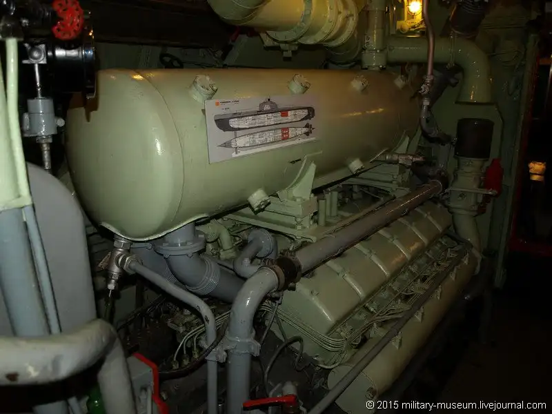 Следующий отсек - пятый - машинный. Там расположены два шестицилиндровых дизеля MAN мощностью по 2000 л.с. и электродвигатели (два сдвоенных основных электродвигателя SSW для полного подводного хода, по 2500 л.с. и два вспомогательных электродвигателя SSW для "бесшумного" хода, по 226 л.с.). Вид на дизели: