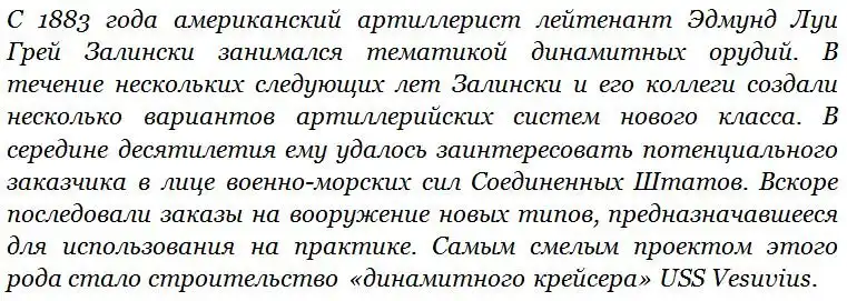 В 1887 году представители ВМС США провели дополнительные испытания 8-дюймовой (203,2 мм) пушки конструкции Залински образца 1885 г. По результатам этих проверок было решено заказать разработку и изготовление некоторого количества орудий увеличенного калибра, которые в обозримом будущем планировалось использовать в составе береговых батарей и на экспериментальном боевом корабле. Все это оружие должно было иметь калибр 15 дюймов (381 мм). Разработка и изготовление артиллерийских систем были поручены компании Pneumatic Dynamite Gun Company, ранее основанной Э. Залински и его коллегами.