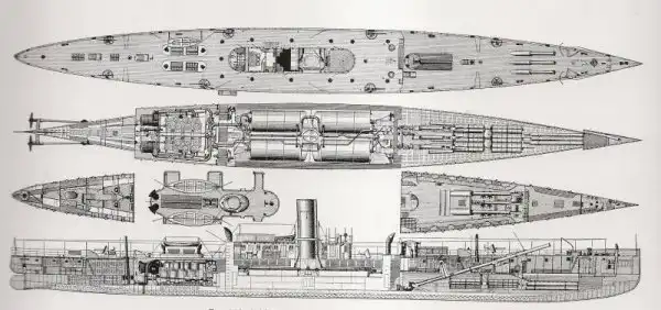 Носовая часть корпуса корабля, примерно треть от общей длины, отдавалась под размещение основного вооружения. Кроме того, в носу помещались некоторые дополнительные отсеки и помещения вспомогательного назначения, а также кубрики для экипажа. Центральный отсек, расположенный непосредственно под надстройкой, вмещал котлы и угольные ямы. В корме имелись главная паровая машина, а также жилые и вспомогательные помещения. Рубка вмещала центральный пост, кают-компанию и т.д. Кроме того, сквозь нее проходила единственная дымовая труба.