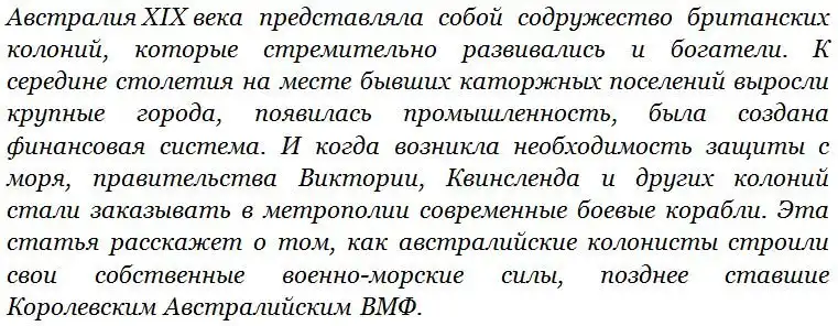Вопреки широко распространённому мнению, британской колонии «Австралия» никогда не существовало. В XIX веке на континенте находился целый конгломерат колоний, которые объединились в Австралийский Союз лишь в 1901 году – Новый Южный Уэльс, Виктория, Квинсленд, Тасмания, Южная Австралия, Западная Австралия. Поскольку большая часть населения этих территорий имела британское происхождение, колонии пользовались широкими правами самоуправления – в том числе, и в столь важном вопросе, как оборонная политика. Это позволяло им содержать собственные вооружённые силы, построенные на добровольческой «милиционной» основе. Примечательно, что колонисты имели право и материальные возможности содержать не только сухопутные, но и морские силы, необходимые для обороны подступов к крупным городам.