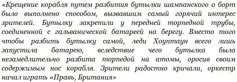 Появление в составе флота новых кораблей было встречено мельбурнцами с большим энтузиазмом. Например, крестной матерью миноноски «Countess of Hopetown» стала леди, в честь которой он был назван – супруга тогдашнего губернатора Виктории графиня Алиса Эвели-де-Мулен. Вот как одна из газет того времени писала о любопытной церемонии крещения корабля:
