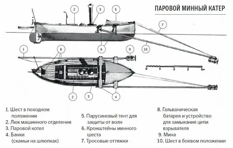 Минный катер 1860-х - 1900-х гг. - это беспалубная шлюпка длиной 10-18 метров с паровым котлом и гребным винтом. Но это бесхитростное суденышко несло 2-3 мощных заряда взрывчатки в цилиндрической или цилиндро-конической металлической оболочке - мины. И поражали они самую уязвимую часть неприятельского флота - подводную.