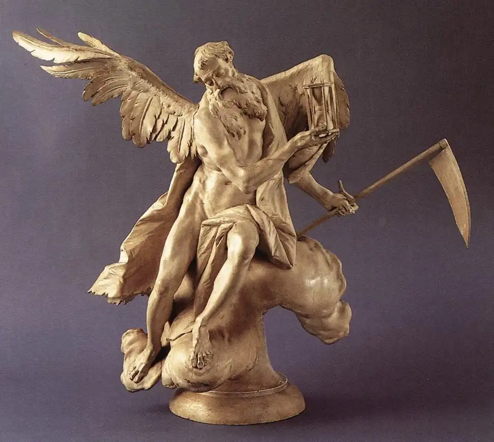 Свою косу (иногда - серп) Мрачный Жнец получил от титана Кроноса. Тот был сыном бога Урана(он же Сатурн) и Геи, богини земли. Своих детей добрый папаша сжирал, зная, что будет убит от руки одного из них. Но последнего, младшенького Кроноса, Гея сумела спрятать и вырастить.