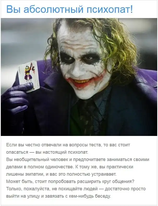 Психопаты в моде — они становятся героями культовых фильмов и сериалов, а молодые люди стремятся быть похожими на них. К счастью, настоящих психопатов среди нас не так много. Но не относитесь ли вы к их числу? Узнайте, пройдя тест от Креизи.