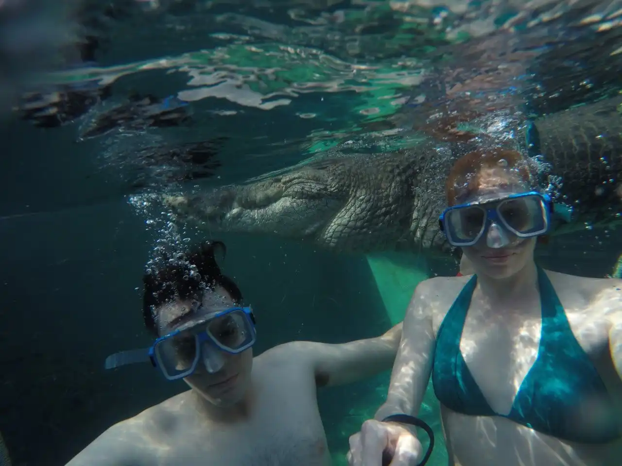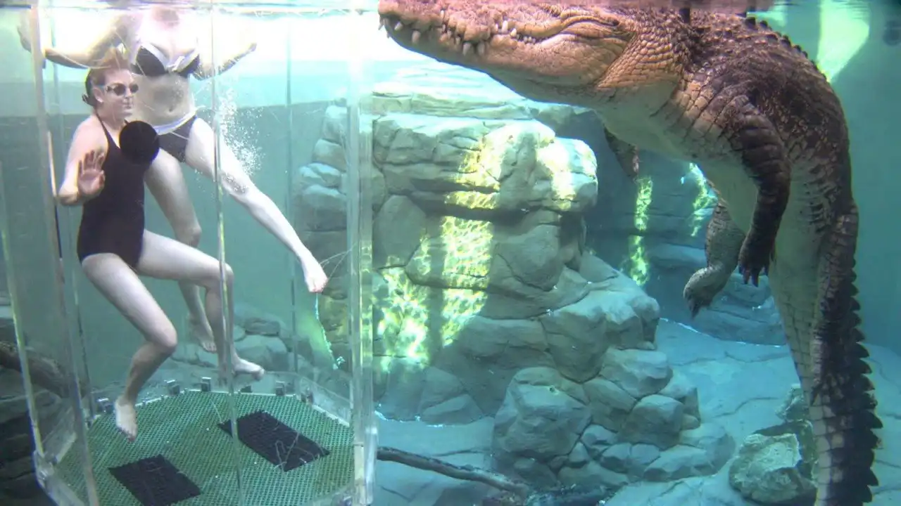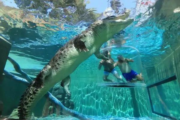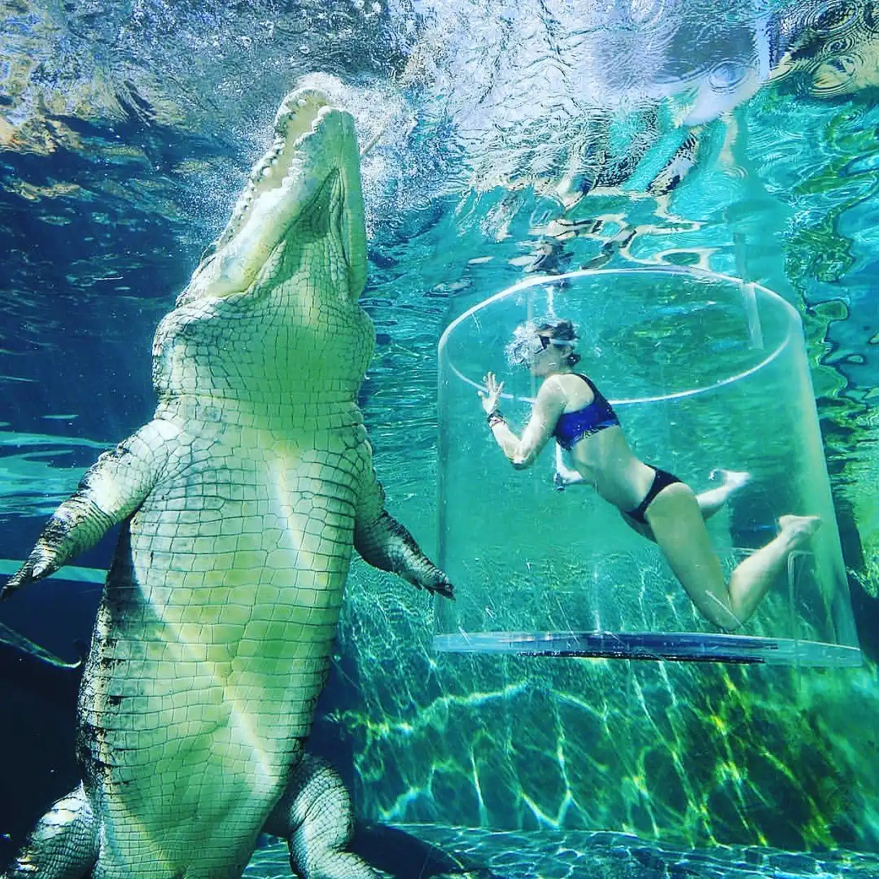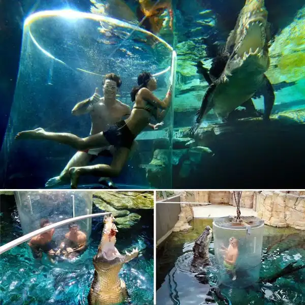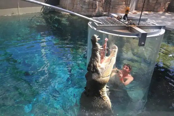 В самом сердце Австралии, в городе Дарвин, находится огромный крокодилий парк аттракционов «Crocosaurus Cove», где можно отлично провести время со всей своей семье. Этот день навряд ли вы когда-нибудь забудете, так как максимально острые ощущения и фантастические эмоции вам 100% обеспечены. В этом парке аттракционов, вы сможете искупаться с крокодилами, правда в специальной клетке для вашей же безопасности, посмотреть на великолепные прыжки крокодилов над водой, подержать маленьких новорожденных крокодильчиков в руках, а также сфотографироваться со всей этой дикой и весьма опасной живностью.