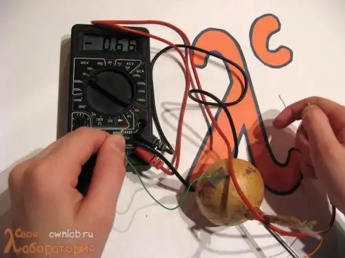 Проделав все вышеописанные процедуры с яблоком, видим, что гальванический элемент из этого фрукта дает аналогичное напряжение.