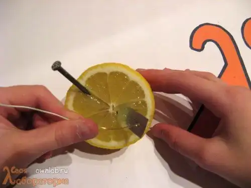 Гальванический элемент готов! Половинка лимона показывает почти полвольта.