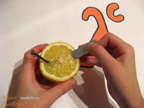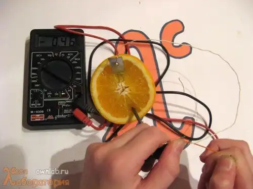 - Овощи или фрукты, которые есть у вас под рукой. Только не говорите окружающим, для чего они вам нужны, а то в следующий раз, когда вам захочется, скажем, апельсинчика, вам не дадут – скажут, мол, опять собираешься продукты переводить. Они будут исполнять роль электролита в нашей партии батарейки (а точнее, содержащийся в них фруктовый сок, который благодаря фруктовым кислотам выполняет роль ионообменной среды).